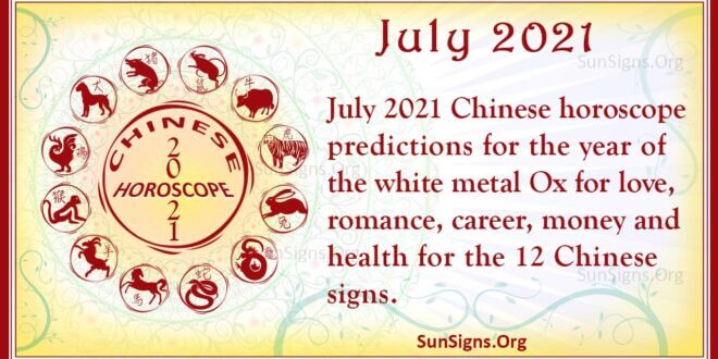 Read on to know more about the 2021 July (Month 7) monthly horoscopes from Sunsigns.Org. Find out how you will fare in the month of July. July 2021 Chinese Horoscope presents you with brief astrology predictions about the various aspects of life such as career, finance, love, and health. It covers all the zodiac signs from Rat to Pig. Read on to know more for this month of the year of the white metal ox.
