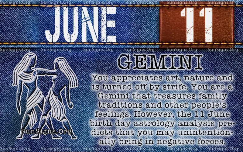 JUNE 11 birthday horoscope predicts that your zodiac sign is Gemini, and you are influential intellectuals. Alternatively, you can combine your creative talents with your business skills. This has proven to be beneficial and profitable. It takes discipline, but you are quite successful. You can become very successful in life.