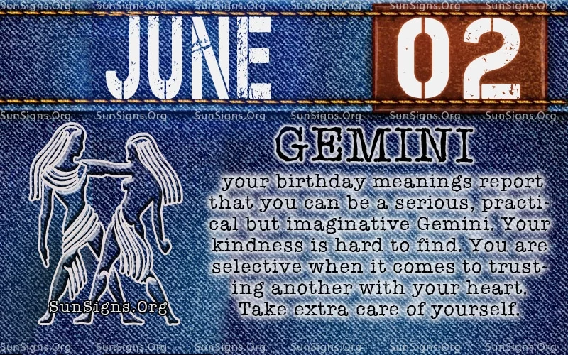 According to your birthday analysis, the Gemini can also be practical yet optimistic. You may be attentive, intellectual, and versatile. Gemini born on this day are spirited individuals.2 june birthday gemini