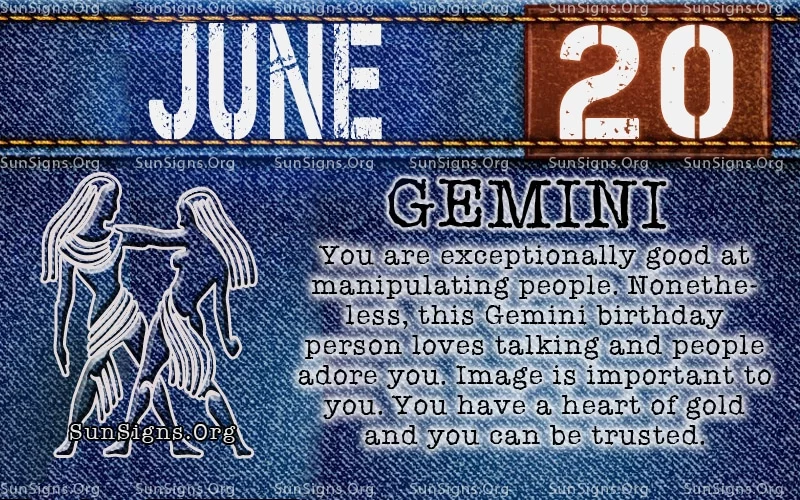 Nonetheless, you are particularly sentimental and intuitive. This quality makes you exceptionally good at manipulating people. You are sharp and like the attention that it can bring to you. You love to talk, and people adore you.IF YOUR BIRTH DATE IS JUNE 20, the Gemini Birthday Analysis shows that people born explicitly on this day are said to be funny, kindhearted and lively. Usually, they have a new outlook on a conversation with you. Those born on this day can be emotionally dependent twins although you may hide your true feelings. The image is important to you, but you can be overly sensitive to some issues.