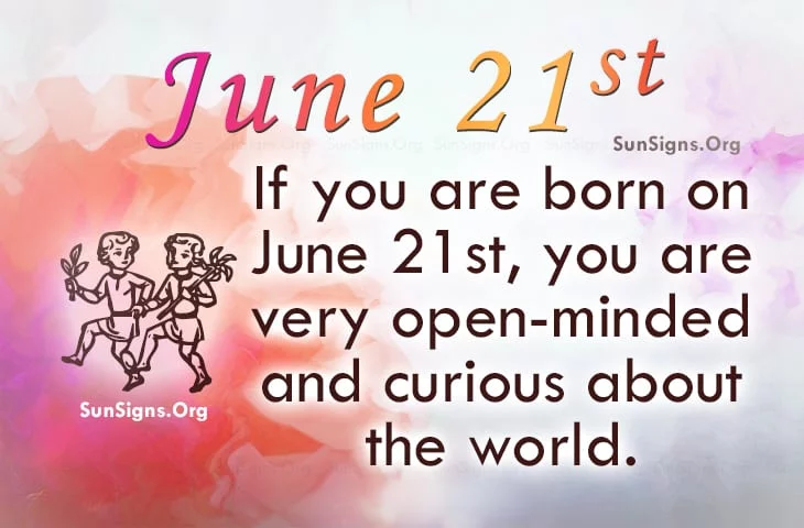Famous people born on JUNE 21 are Gemini who don’t like being on his or her own. They feel better being with someone else preferably their soul mate. They are grounded but have a tendency to worry constantly.