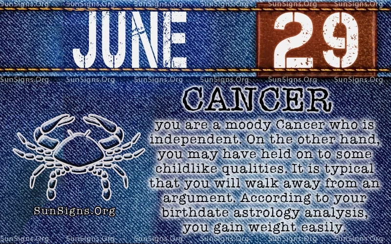 The June 29th zodiac birthday analysis for someone born under the zodiac sign of Cancer predicts that you may tend to put things off or hide your true feelings. This quality however negative can put you in a bad mood.