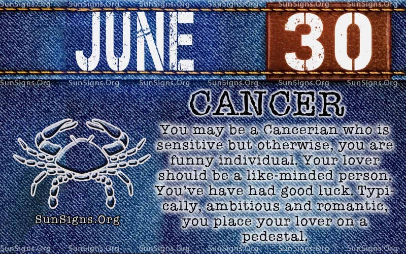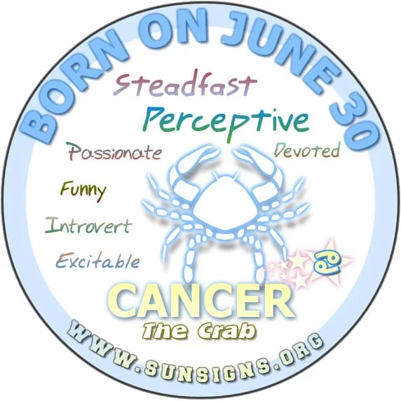 According to the Cancer birthday horoscope, people born on this day are special people. You have a no-nonsense approach to life, and you are kind to those you meet. Additionally, you are funny and sometimes, you can be excitable.IF YOUR BIRTHDAY IS JUNE 30, you are most comfortable in home surroundings, with close relatives and friends.