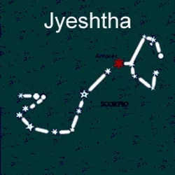 The Jyeshtha Nakshatra is the 18th of 27 Lunar Mansions in Vedic Astrology. Antares, one of the stars in Jyestha’s cosmic counterpart Scorpio, sits at the head of the Scorpion. Translated, Antares is the rival of Mars. This is due to its red color and the fact that it sits opposite Mars every second year.
