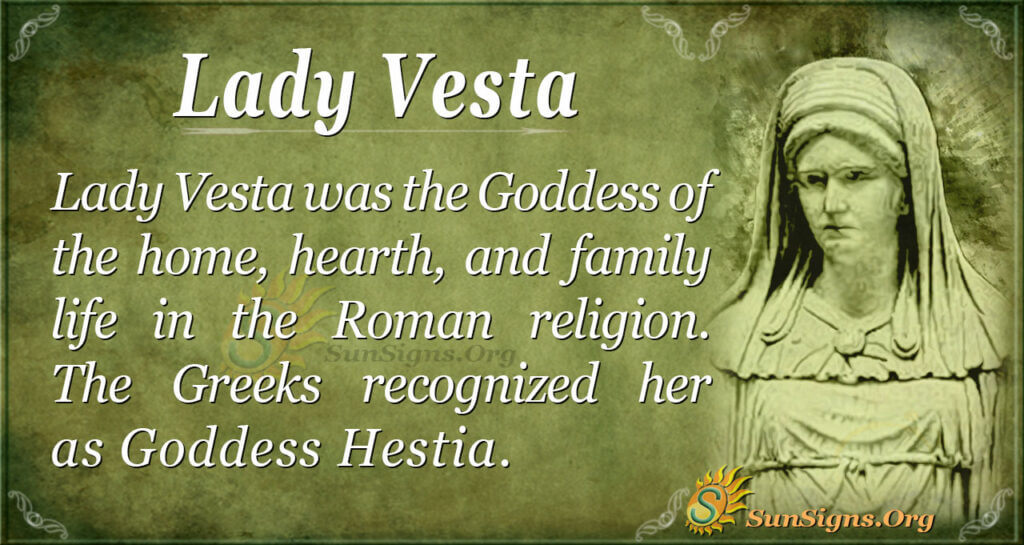 Lady Vesta was the Goddess of the home, hearth, and family life in the Roman religion. The Greeks recognized her as Goddess Hestia. She was born the first child of the Titans Kronos and Rhea. Like all other children, her father swallowed her. Her brother, Jupiter, managed to escape his father and so he was not swallowed. He later released his siblings from the bondage of his father.