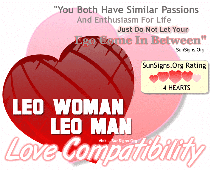 Leo Woman Compatibility With Leo Man Match:- Being from the same fire sign, they share the same passion and lust for life. However, they both have the same ego and need for control so someone has got to give. The Leo woman and Leo man soulmates are a great couple as long as they are on the same path but if they disagree they have a hard time backing down. This is the same in the bedroom as well. Their sex is amazing because they both want the same thing but they might argue over who is on top! But in time they will learn to share and then their relationship will grow. Continue Reading…