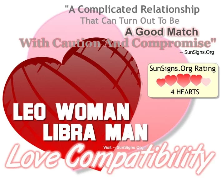 Leo is a fixed fire sign whereas Libra is a cardinal air sign, the Leo woman Libra man compatibility gets a FOUR Hearts rating. The Leo woman Libra man relationship has a lot of promise, so make the most out of it! This love match shares excellent compatibility with each other.