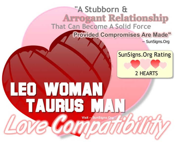 Leo is a fixed fire sign whereas Taurus is a fixed earth sign, the Leo woman Taurus man compatibility gets a TWO Hearts rating. If they can reach a compromise, they will have a partner for life. Otherwise this Leo woman Taurus man zodiac match can be difficult.