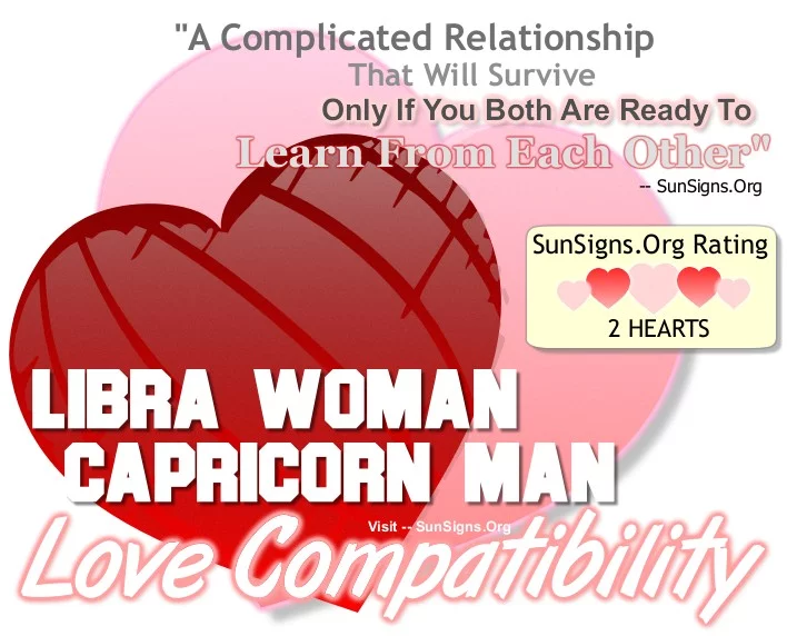 Libra is a cardinal air sign whereas Capricorn is a cardinal earth sign, the compatibility gets a TWO Hearts rating. You will not find a more loyal pair, and if they are willing, they can go the distance.