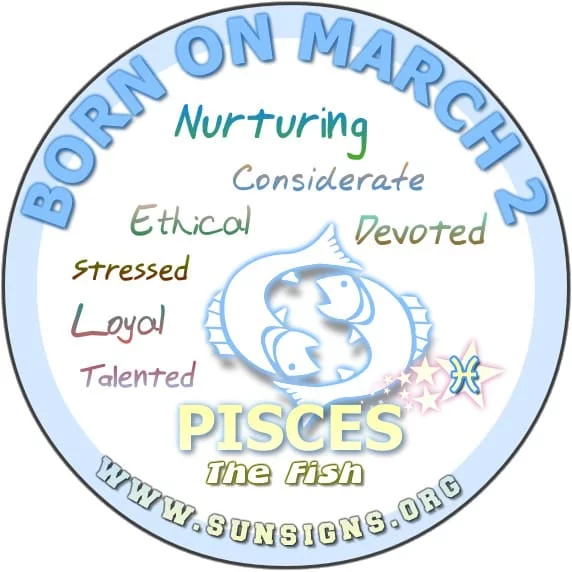IF YOU HAVE A March 2 Birthday, you are a Pisces that has sound moral values, and you know how to get things done. You have a side that is loving and caring. You will meet anyone in the middle to solve any crisis or conflict.