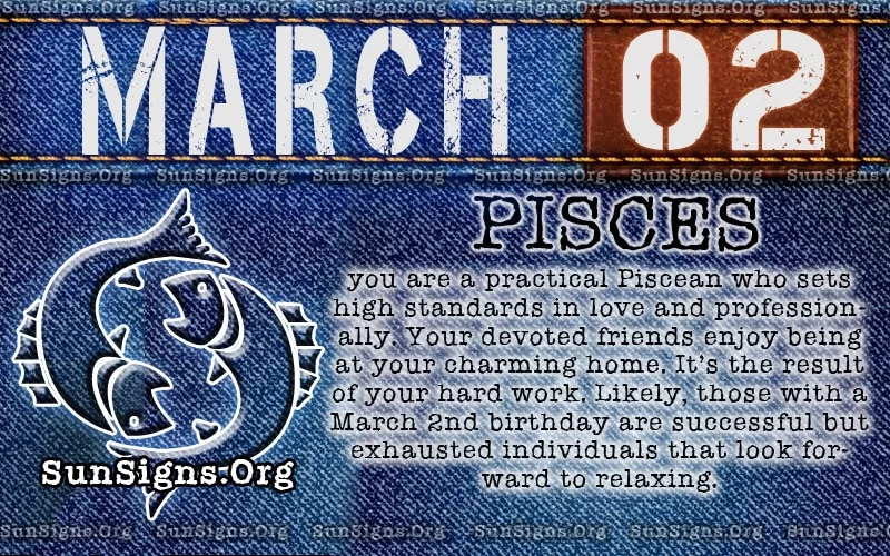 IF YOU HAVE A March 2 Birthday, you are a Pisces that has sound moral values, and you know how to get things done. You have a side that is loving and caring. You will meet anyone in the middle to solve any crisis or conflict.