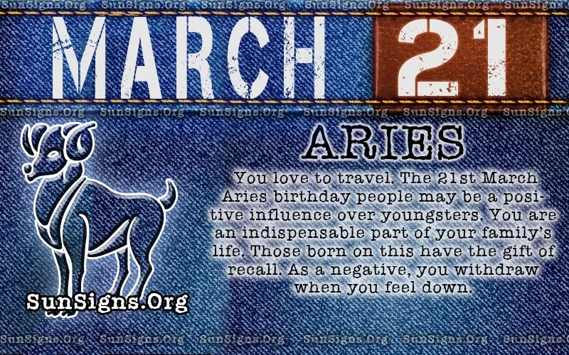 As the zodiac sign for your 21 March birthday is Aries, you can be a great politician or athlete. You have this weird power over people, allowing you to make friends easily. Aries, you know how to make a person feel special.march 21 birthday personality If you are an Aries born on this day, your birthday personality shows that you do not cheat on your partner or flirt with others while in a relationship.