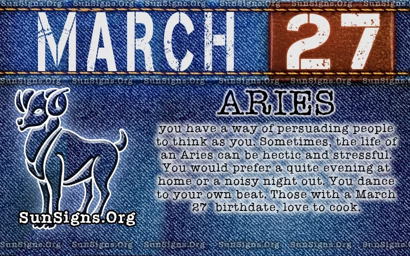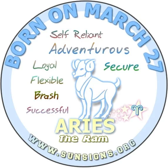 The zodiac sign for your 27 March birthday is Aries and you are without a doubt a self-reliant and adventurous Arian although you love being at home. A quiet evening with someone you care about suits you well but sometimes you want to feel the beat. You want to party and let your hair down.march 27 birthday personality The March 27th birthday horoscope shows that you value your loved ones and their thoughts and opinions, but you can get them to see your point of view. It does not take much to persuade them to think as you do.