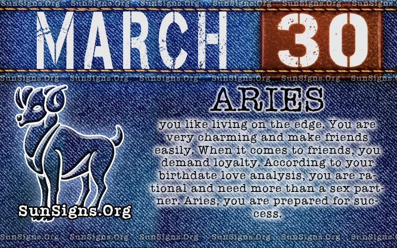 Arians with a March 30 birthday need to acquire knowledge so they do extremely well in the classroom. You would make a brilliant speaker or university professor. In addition, Aries makes great financial advisors or stockbrokers.