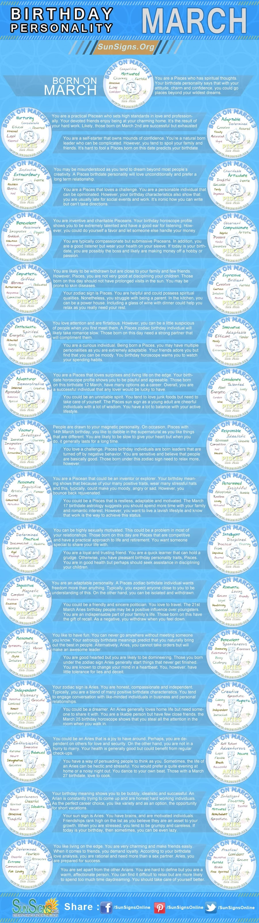 Enjoy the Infographics for all March birthday horoscopes. Find your birthdate meanings from March 1st to March 31st instantly from pictures. So what exactly are these birth date Infographics? If you are born on any day in March and would like to know more about your birthday personality traits, then take a look at these images.