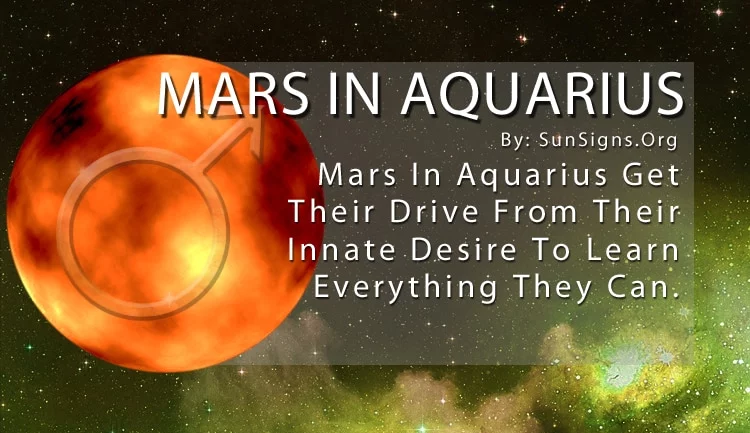 As an air sign, Aquarius is most interested in intellectual pursuits. So Mars in Aquarius gets their drive from their desire to learn everything they can. Their innate need to add to their wealth of knowledge keeps them moving forward and allows them to maintain a unique perspective.