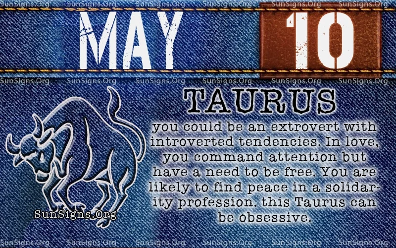 In love, the May 10 zodiac Taurus characteristically feels complete with a romantic companionship. Consummation of the relationship is often repeated moment bull. You could be anywhere, and when nature calls this Taurus born, you should be ready to ride on the wild side.