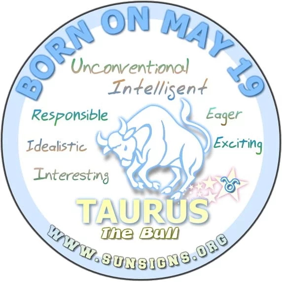 Naturally, those born on this birthday are independently secure in their values. You take your duties responsibly and enjoy being around others. The Taurus birthday individuals born on May 19 are likely to make new friends with ease and perhaps have too many acquaintances.