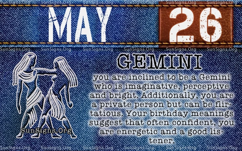 This charismatic Gemini can be sensitive but holds strong opinions. You carry yourself with dignity, as you are private and often very confident. These Gemini birthday individuals are naturally flirtatious, energetic, and charming. Love, friendship, and loyalty are extremely important for a person born on this day.IF YOUR BIRTHDAY IS May 26, then you are a Gemini who is imaginative, perceptive and bright. These are the qualities most wanted in a lasting relationship. When this May 26th zodiac person is ready to commit, they will need a partner who is a good listener and is worthy of trust and devotion.