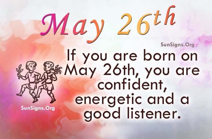 Famous people born in May 26 are inclined to be a Gemini who is imaginative, perceptive and bright. Additionally, they are private but can be flirtatious. Often confident, they are energetic and a good listener. Friendships are extremely important to those born on May 26.