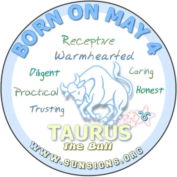 MAY 4 birthday horoscope predicts that you are honest and more reserved than the other Bulls. This ambitious, diligent, and practical individual can sometimes display exaggerated authority. This needs to be controlled if you wish to be socially accepted.