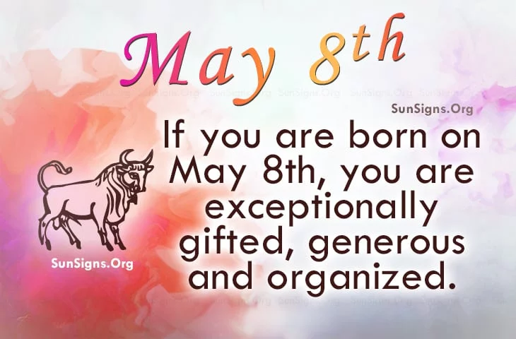 Famous people born on May 8 are a self-reliant, brainy and attractive Taurus. However they do not like sudden changes. They are capable of managing a mass amount of finances and this can be stressful. They are almost exempt from illnesses.
