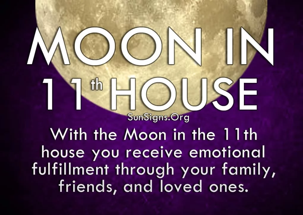 The Moon in the 11th house person has so much you want to do that you may not be able to achieve it all. This can leave you feeling depressed or uneasy. That can make you doubt yourself or the direction your life is going. Make sure you surround yourself with people who can help during these troubled times.
