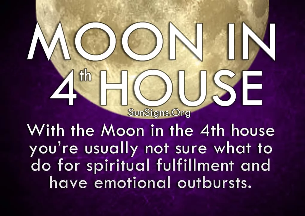 In astrology, the Moon symbolizes your emotional growth and well-being. With the Moon in the 4th House, you’re usually unsure what to do for spiritual fulfillment. You often feel restless and have emotional outbursts, which don’t help you feel settled in any way. Change is both desired and feared.