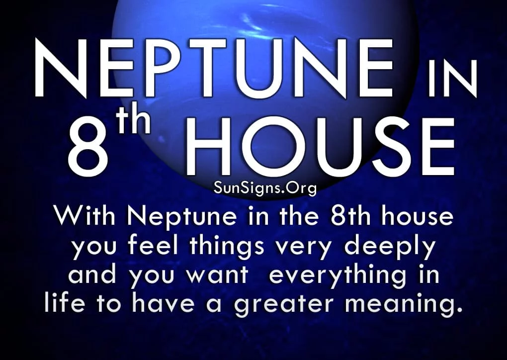 It is true of other areas in the life of Neptune in the eighth house personality as well. Because you feel everything so deeply, you want all things in life to have great meaning. And you are quite skilled at seeing more in a day than others would see in a week. Most people pass by a situation or think very little of it. But, you can scale the depths of it and find more underneath. (Scorpio being your ruling star sign, is responsible for this).