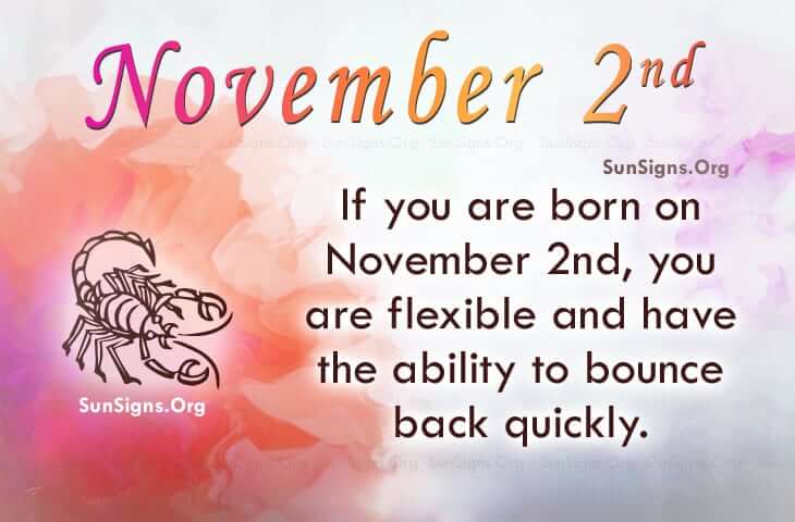 Famous people born on November 2nd are not afraid to quit a job if it restricts too much of their creative freedom. Being the flexible and smart individual that they are, they have the ability to bounce back quickly. As a negative birthday personality trait, they are possessive.
