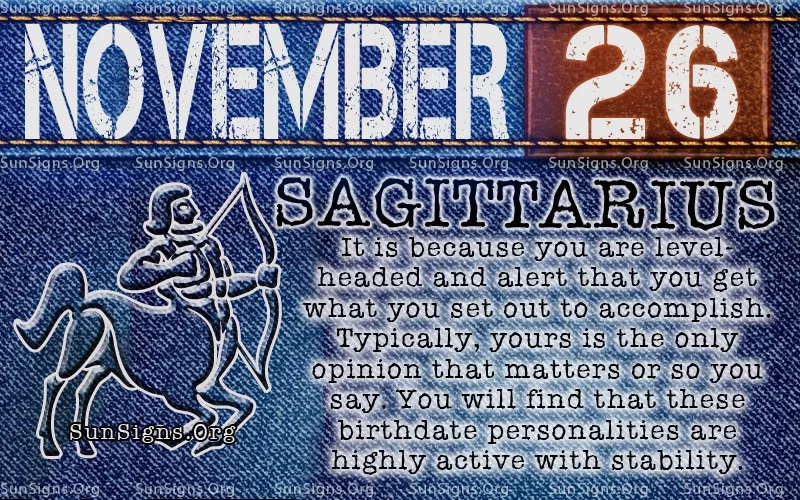 NOVEMBER 26 birthday horoscope predicts that you are a Sagittarius who is positive and highly confident. You are kind and normally, look for the best in everyone you meet and in most situations. You have a big heart.
