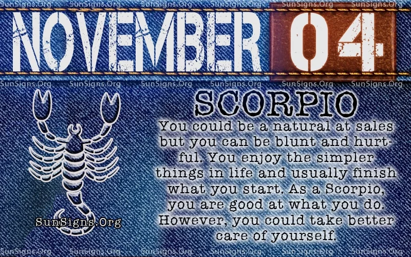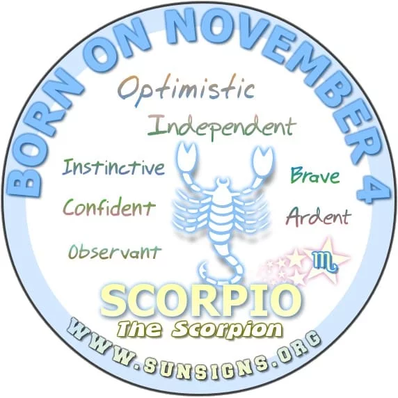 IF YOUR BIRTHDAY IS ON November 4, you are an intelligent Scorpio who loves to talk! You are likely to tell it like it is, without hesitation of hurting someone’s feelings or any repercussions.