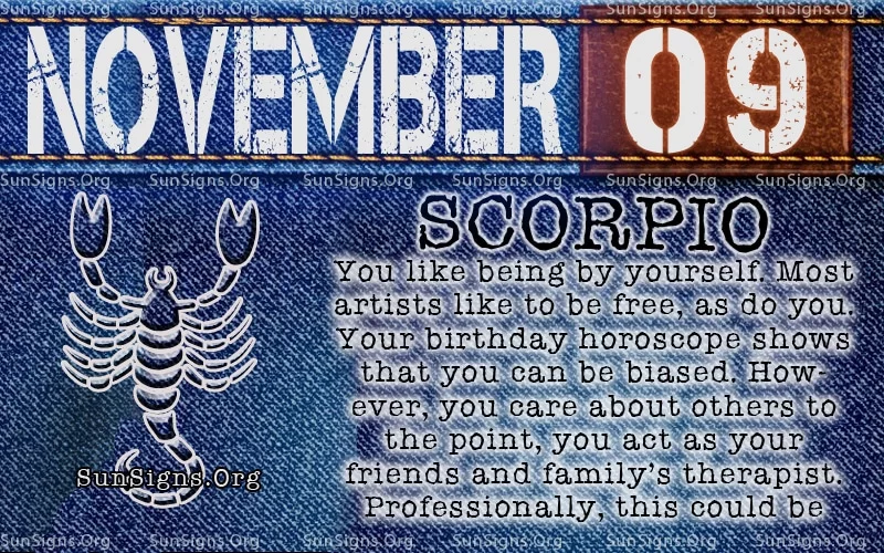 Mainly, as the November 9 birthday zodiac sign is Scorpio, you are comfortable with yourself. You prefer to go primarily unnoticed. You are creative and caring. These qualities are what make you good at what you do. Career-wise, you are best suited in fields in which you can help other people such as being a therapist.