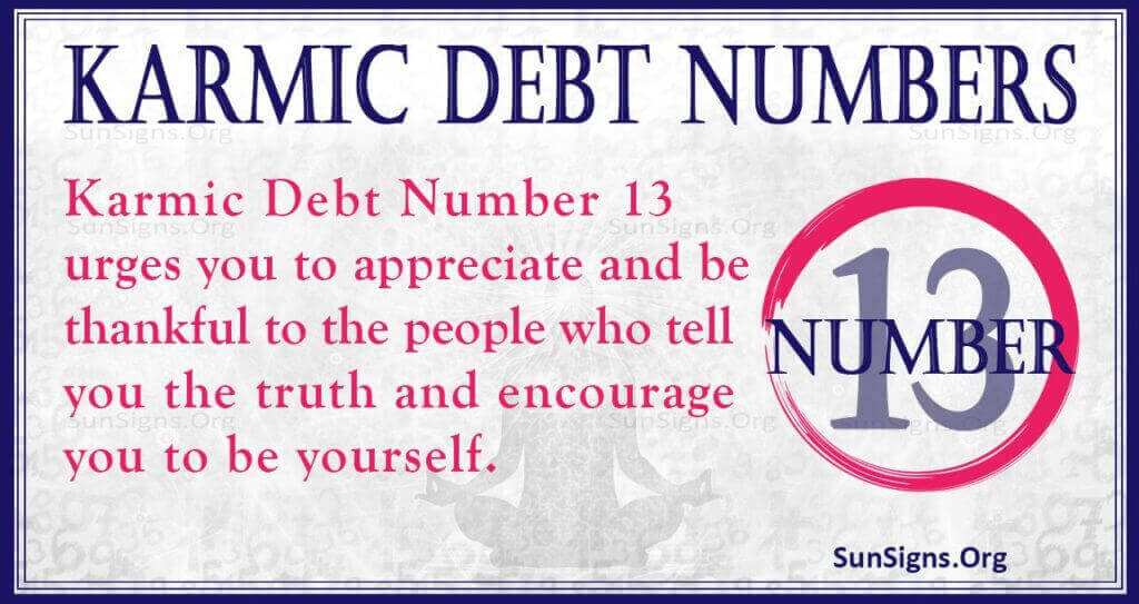 Karmic Debt Number 13 urges you to appreciate and be thankful to the people who tell you the truth and encourage you to be yourself. Not everyone around you is happy when you succeed in life.