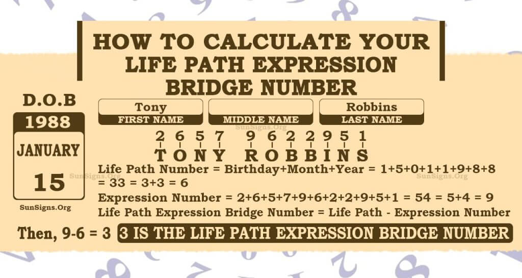The Life Path / Expression bridge number gives you an idea about who you are. It helps bridge the gap between what you are and what you are trying to become so that you take the proper steps in life and succeed in whatever you do.