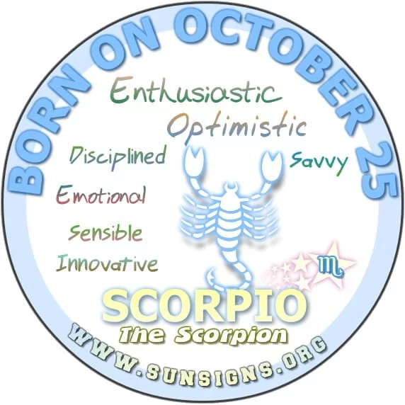 IF YOUR BIRTHDAY IS ON OCTOBER 25, then you are emotional, enterprising, and analytical. Additionally, you are enthusiastic and disciplined regarding matters concerning your money, friends, and family.