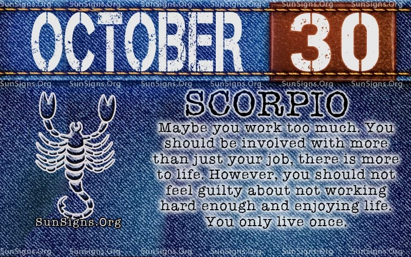 IF YOUR BIRTHDAY IS OCTOBER 30, you are a Scorpion who loves to learn. Life’s lessons come in many forms and not just by observing can you learn all of them. More often than not, you should be a participant. Those of you born today are highly sensitive and passionate.