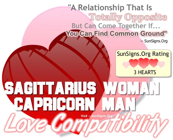 How compatible are Sagittarius women and Capricorn men mentally, emotionally, and sexually? The best word to describe the Sagittarius woman and Capricorn man is the opposite. The fiery female archer is always on the go, while the earthy male goat is steadfast and stable. She is full of energy and he is full of determination. Together, though, these two zodiac signs can help each other.