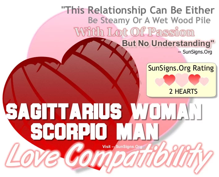 Sagittarius is a mutable fire sign whereas Scorpio is a fixed water sign, the Sagittarius woman Scorpio man compatibility gets a TWO Hearts rating. There will be a lot of give and take with this Sagittarius Scorpio couple, and they will have to compromise if they want to stay together.
