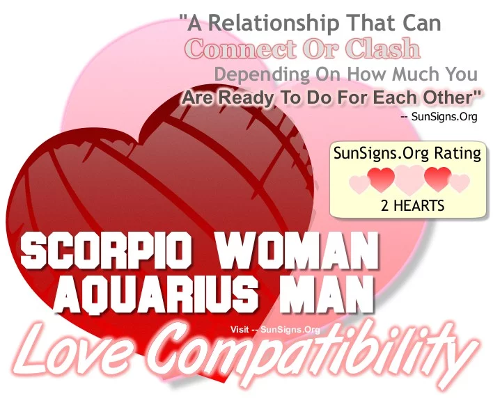 Scorpio is a fixed water sign whereas Aquarius is a fixed air sign, the Scorpio woman Aquarius man compatibility gets a TWO Hearts rating. This Scorpio Aquarius relationship depends a lot on the personality of the two zodiac signs and how much each one is ready to compromise.