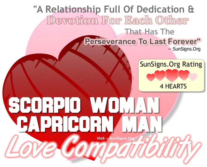 Scorpio is a fixed water sign whereas Capricorn is a cardinal earth sign, the Scorpio woman Capricorn man compatibility gets a FOUR Hearts rating. It will take a lot of work for these two sun signs to stay together, but once they pledge their devotion they are in it for life.