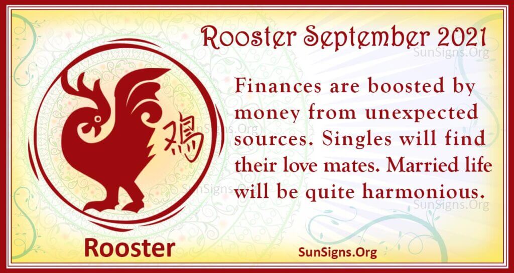 September 2021 promises to be a tremendous month for Rooster individuals. There will be money from unexpected sources and inheritances.