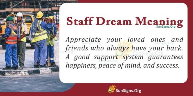 Seeing a dream about a staff of people is a sign that you need support from others in your waking life. It might also be a sign that you should help the people who come to you for assistance. The power of a group will enable you to achieve great success.