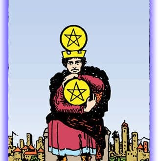 The Four of Pentacles represents a time of financial stability, with the underpinnings of your wealth built on sturdy grounds. You have a decided sense of practicality and are pre-disposed to being cautious with your money. This, however, has a dark side, greed an obsession with money, and a tendency to be living an overly ‘safe’ life and therefore not enjoying the benefits of your wealth.