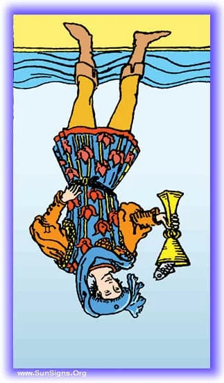 The Page of Cups reversed represents emotional immaturity or problems with self-consciousness, insecurity, and selfishness. When our emotions are out of check, they can cause all sorts of trouble.