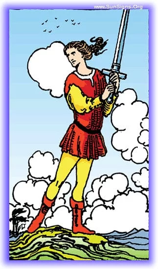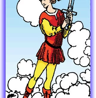 The Page of Swords stands ready, the holder of the starting flag among these young heralds of the Minor Arcana. All Pages signify new beginnings, full of unbridled enthusiasm. Like all Pages, the problem is keeping it up.