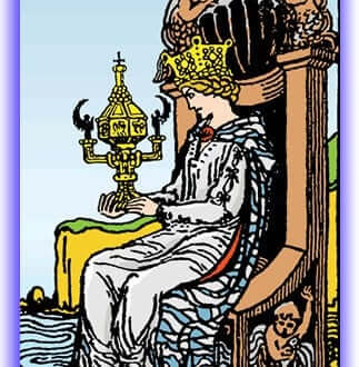 She is calm, secure, and loving and sits on her throne at the edge of the sea. Her cup represents her thoughts, closed and introspective. She is deeply intuitive and can represent a counselor or psychic.