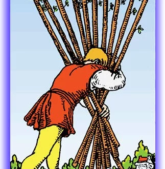 The Ten of Wands represents the traveler bearing the last of his burdens. It is large and almost more than he can bear, but his perseverance has borne him thus far, and it shall bear him over the last stretch.