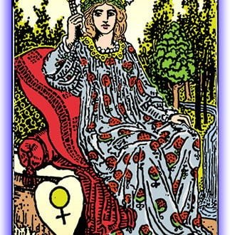 The Empress tarot card of the Rider Waite deck is the supreme mother, fecundity, and the source of creation personified at this moment. Her crown and scepter signify her ruler-ship over all things, and the shield she bears is often shown to bear the mark of Venus, goddess of love and beauty. She is surrounded by a wheat field, signifying great fertility and the comforts of home.