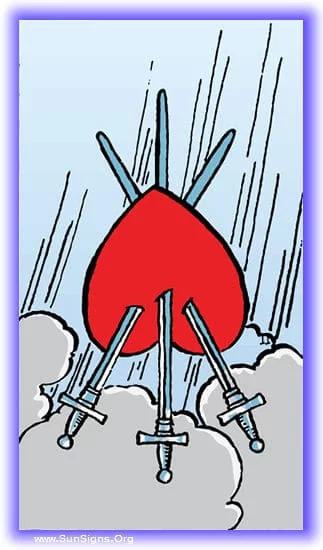 You are interested in understanding the meaning and interpretation of the three of swords tarot. You will find all you need as you keep reading. This is one of the most clearly pictured cards in the Minor Arcana. This card pierces a suspended heart against a stormy sky. The pierced heart is a common symbol, representing every spectrum of emotion from pain to feeling love deeply. But the swords represent violence and painful truth, intellect can bring to the hearts realm. The cold rain falling in the background represents sorrow.